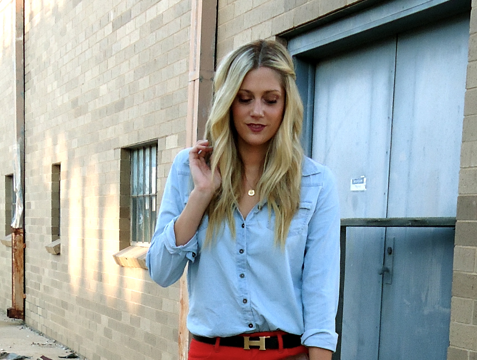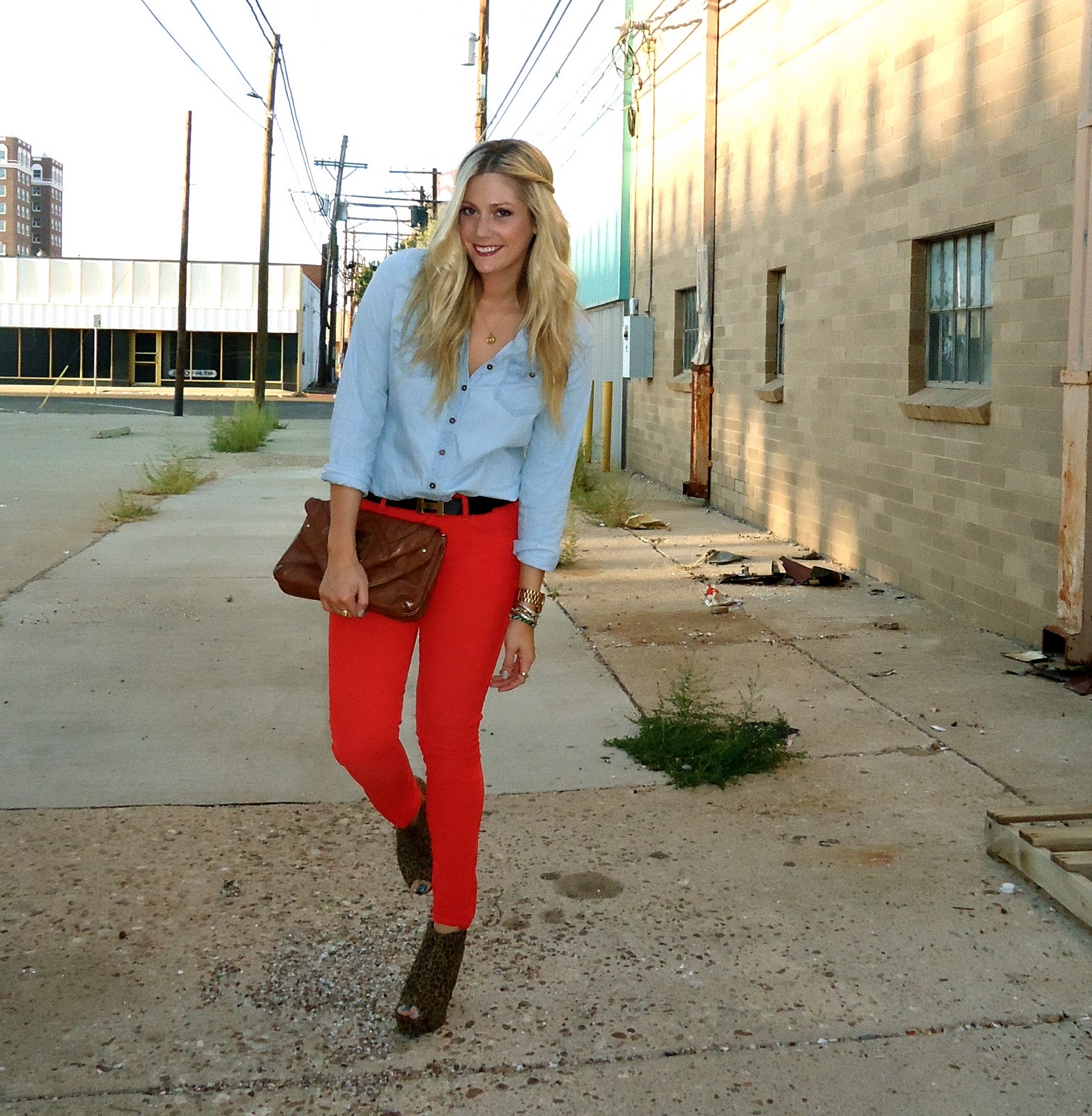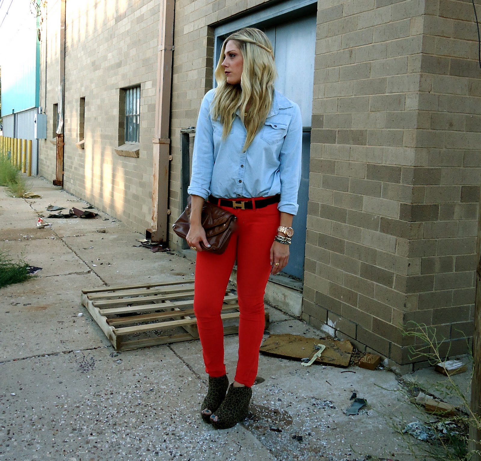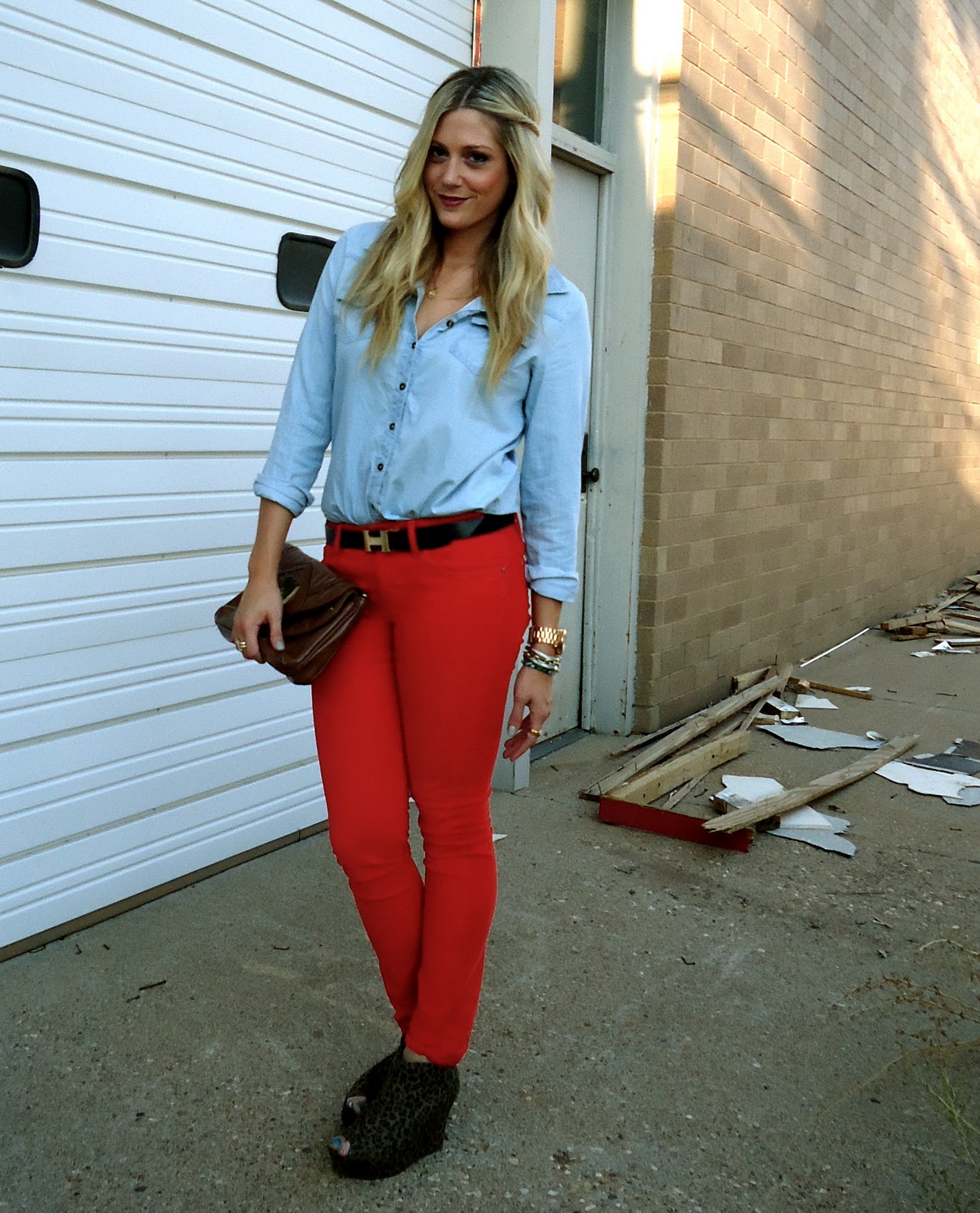 LOVE this look Dev!! So funny that you wore those leopard shoes because I wore mine yesterday with orange jeans haha 🙂 Great minds think alike! I love a denim or chambray top paired with a red bottom… skirt, jeans, shorts, whatever… you look great… always super pretty!!!