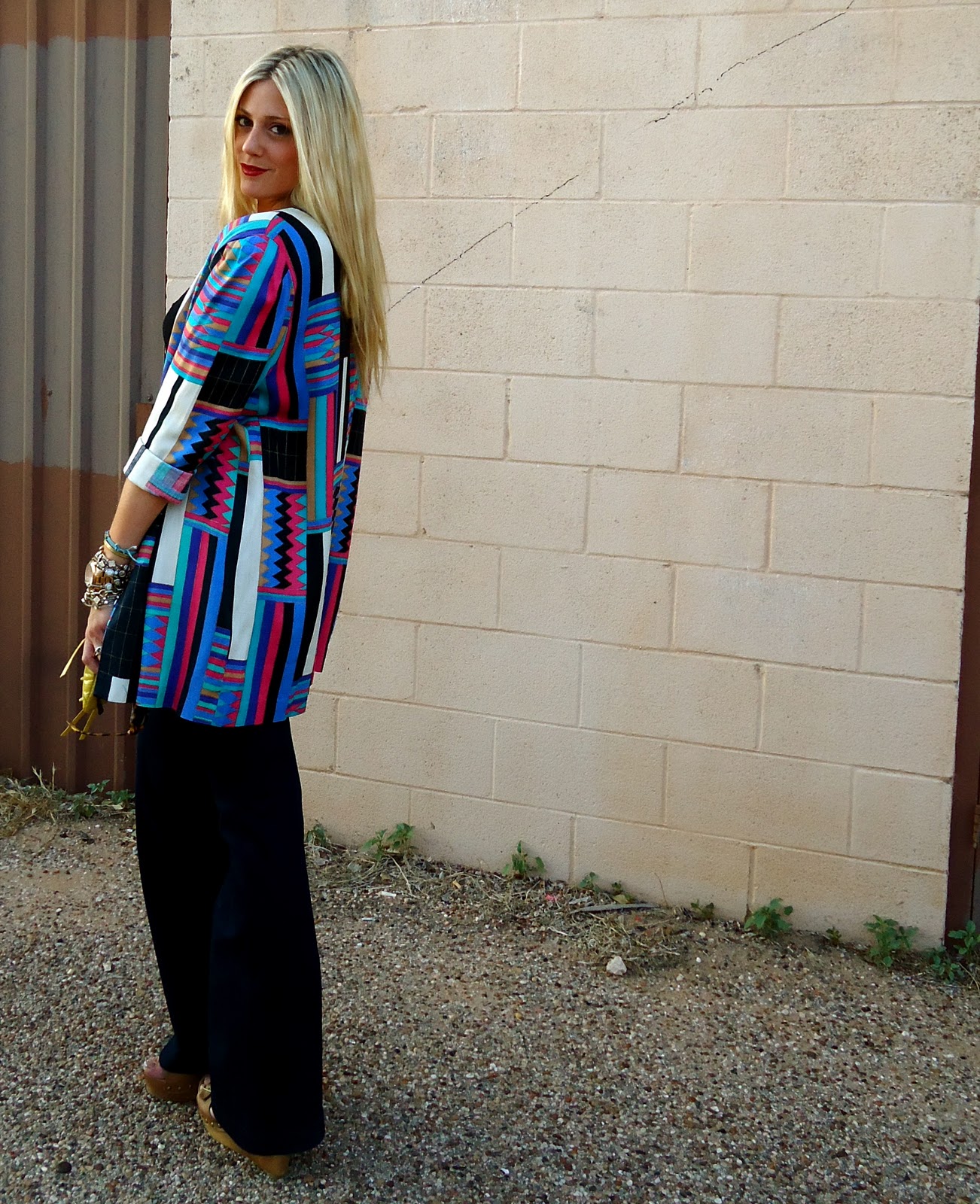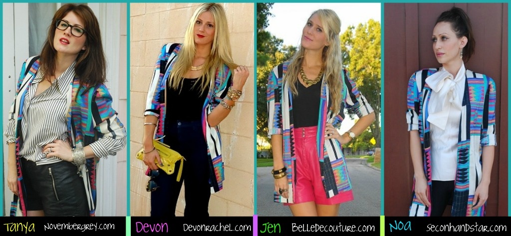 Jen at Belle De Couture, Tanya at November Grey, and Noa of Secondhand Star. Tanya came up with the idea to have this little sisterhood-of-the-traveling-garment in order to meet other bloggers across the nation who share the common love of vintage. Each time we swap, the piece is shot from literally sea to shining sea (no, really: from Cali to Texas to Florida and NY). I got the pleasure of finding the piece this time, so when I came across this insane tribal jacket while vintage shopping, I couldn’t say no. And, I mean, why would anyone? Seeing one piece styled so differently on each blogger really tickles my fancy. Call me crazy (or don’t), but I die for a long jacket. It is so right now and obviously so chic.