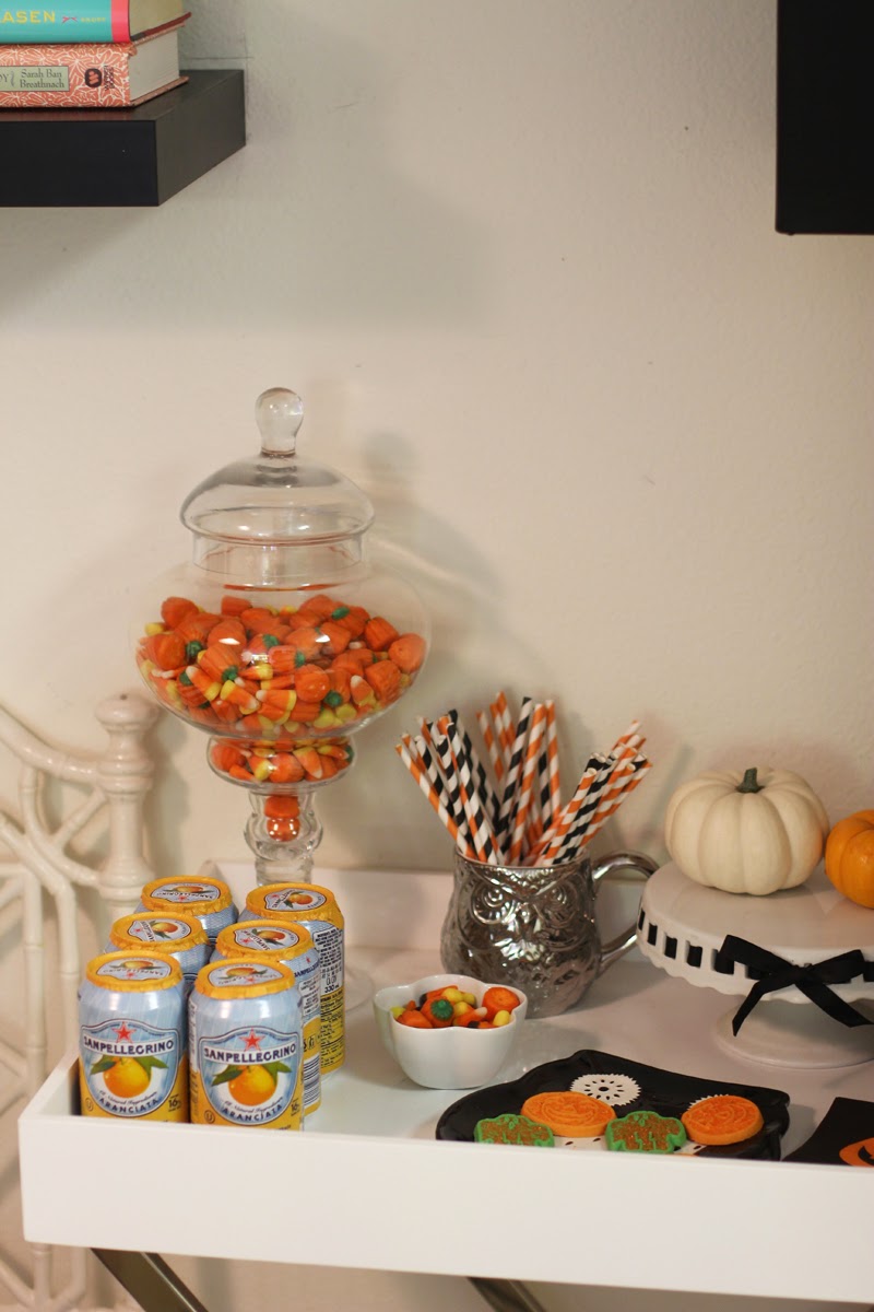 Whew, this post had more DIY than I’m used to! It never hurts to get down and dirty to decorate, right? This year, I stuck with a (shocker) black and white theme with touches of orange here and there. I spray painted the large pumpkins white and even carved one for a vase! That was my favorite piece of decor this year. I also painted the small pumpkins on my mantle black and white striped. I filled one of my jars with candy corns, an easy and inexpensive way to decorate.