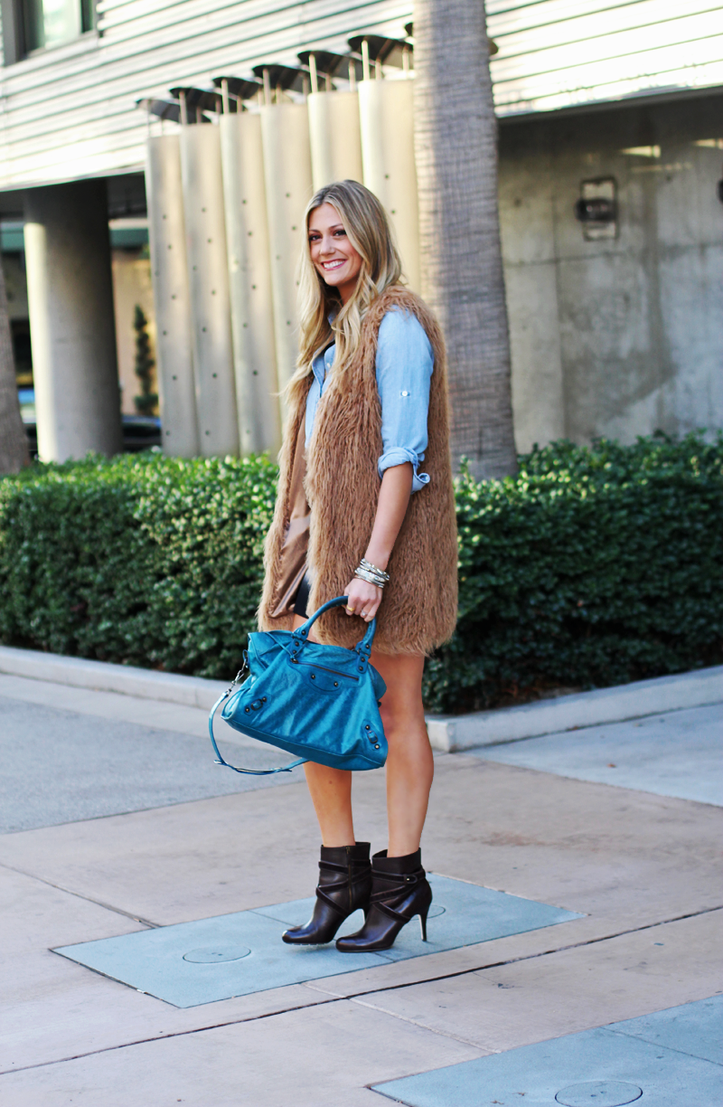So, those booties are insane. Love them! Also love the fur vest with this outfit!