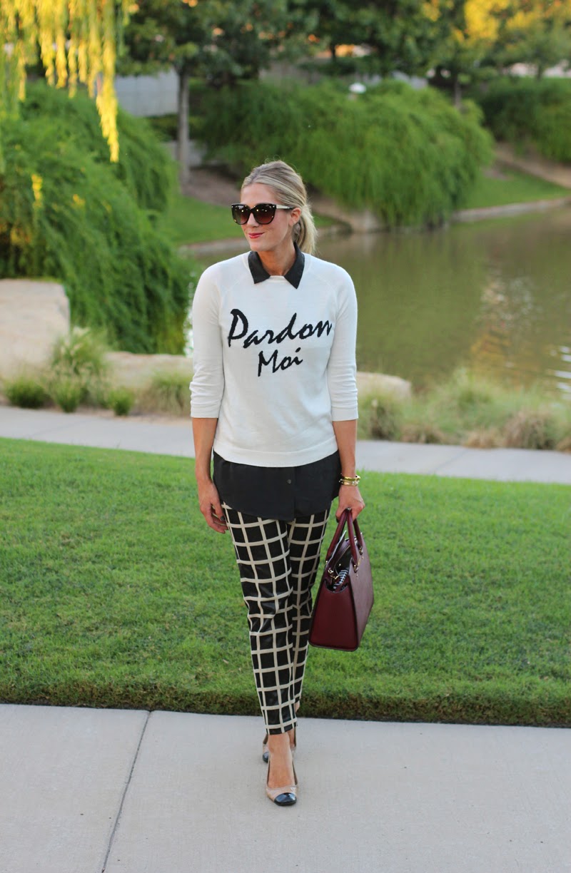 Aw, Devon this is adorable! I love the cheeky sweater with the window pane print pants! Such a cute pairing!