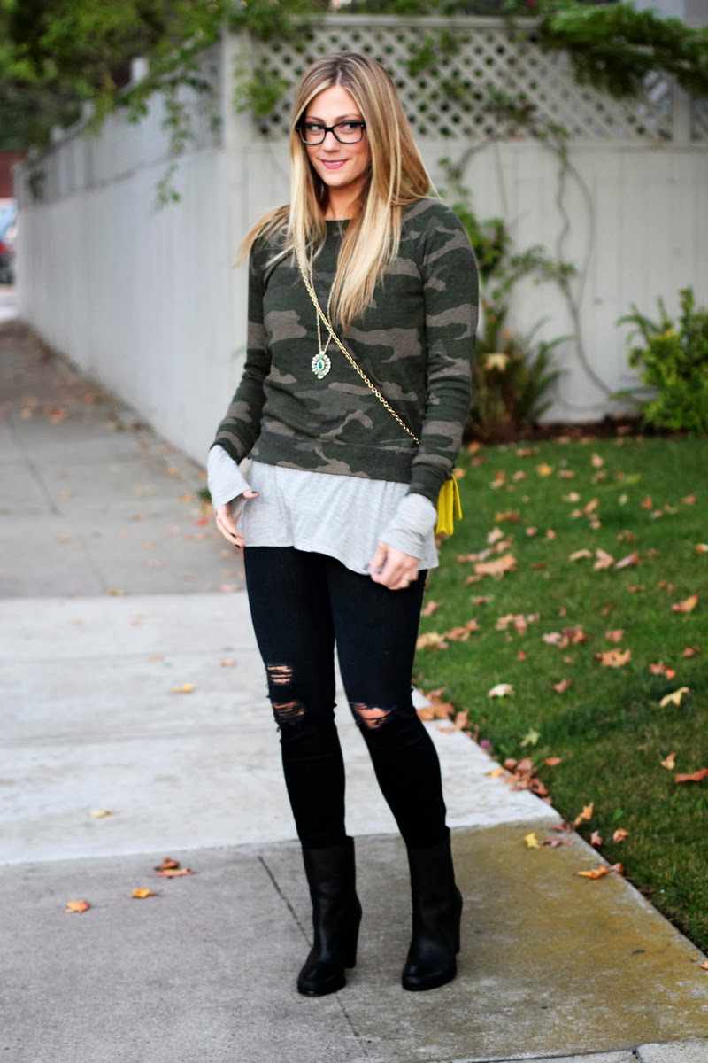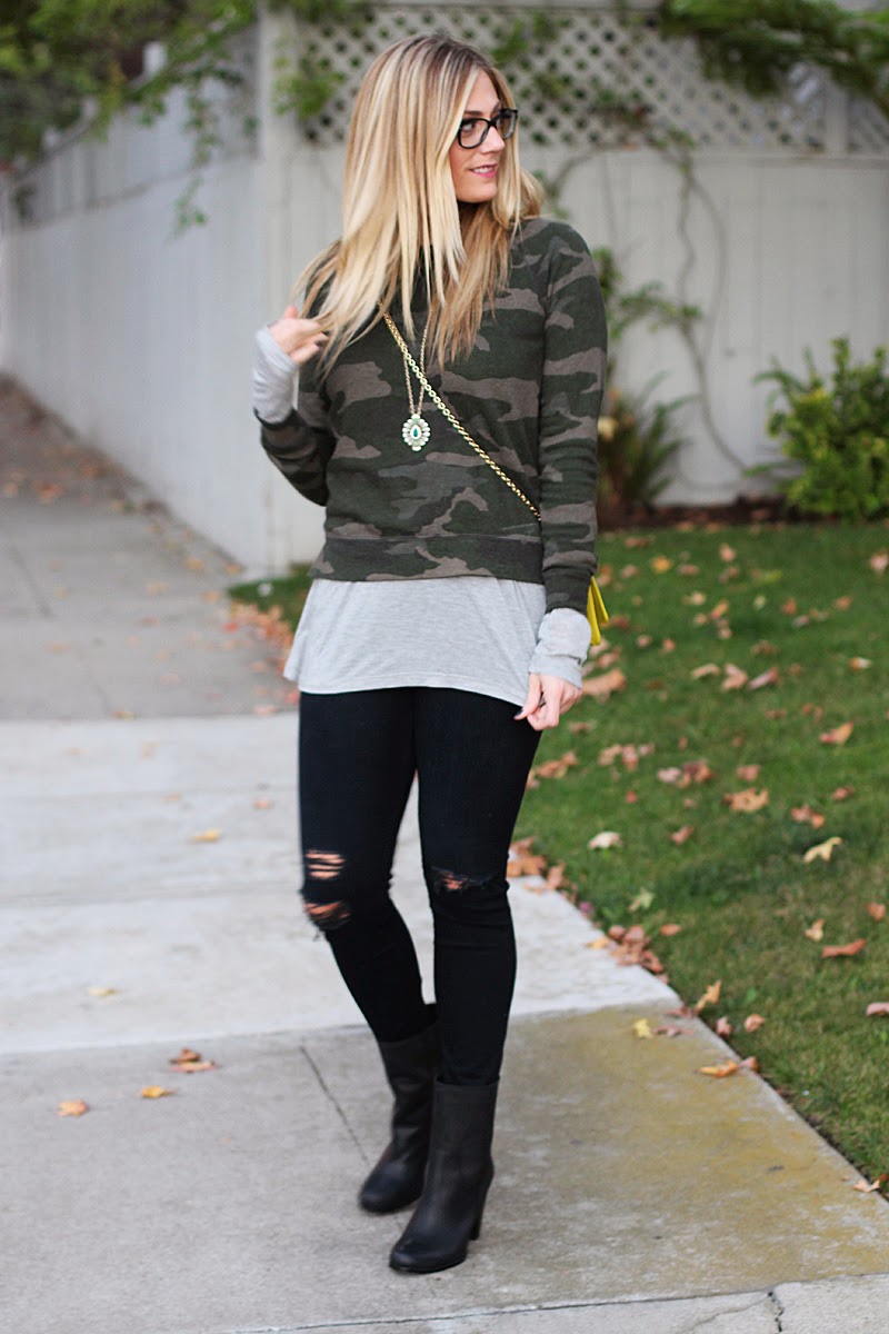 You look so cute in glasses!! Love the camo sweatshirt casual!