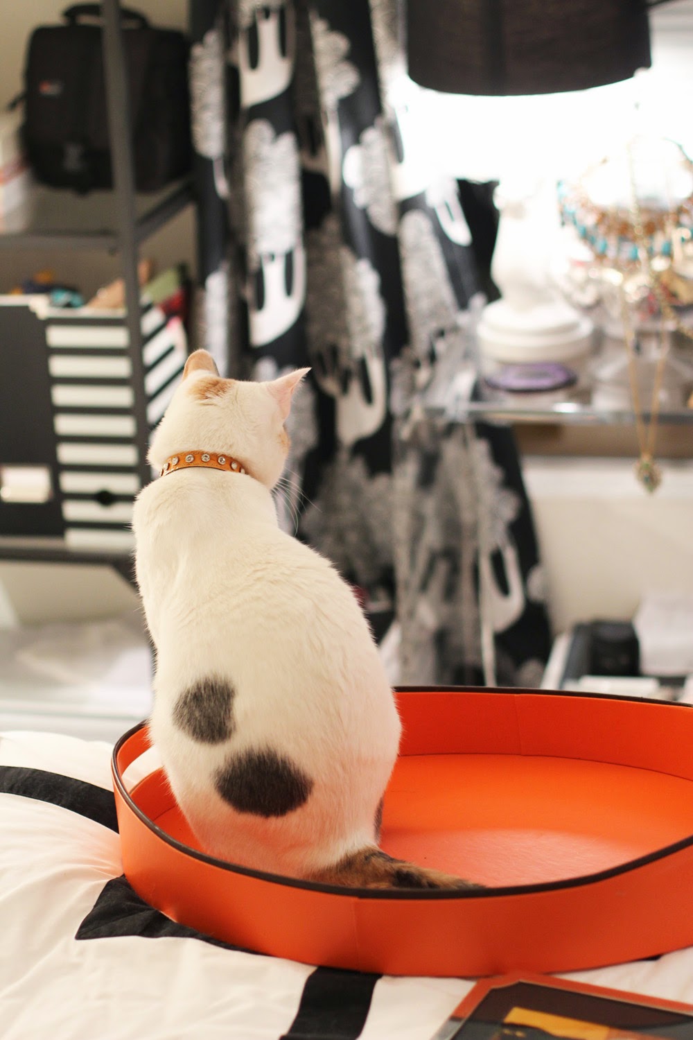 Last but certainly not least, my sweet Stella. She was sitting in a beyond cute position last night as I was working on styling some areas of my home. I set this tray on my bed for a minute and she plopped right in. I was glad she stayed still for the two seconds I needed to take the picture. Cats are not like dogs. It is not easy to get them to cooperate when they see a shiny object in the distance, or a squirrel.