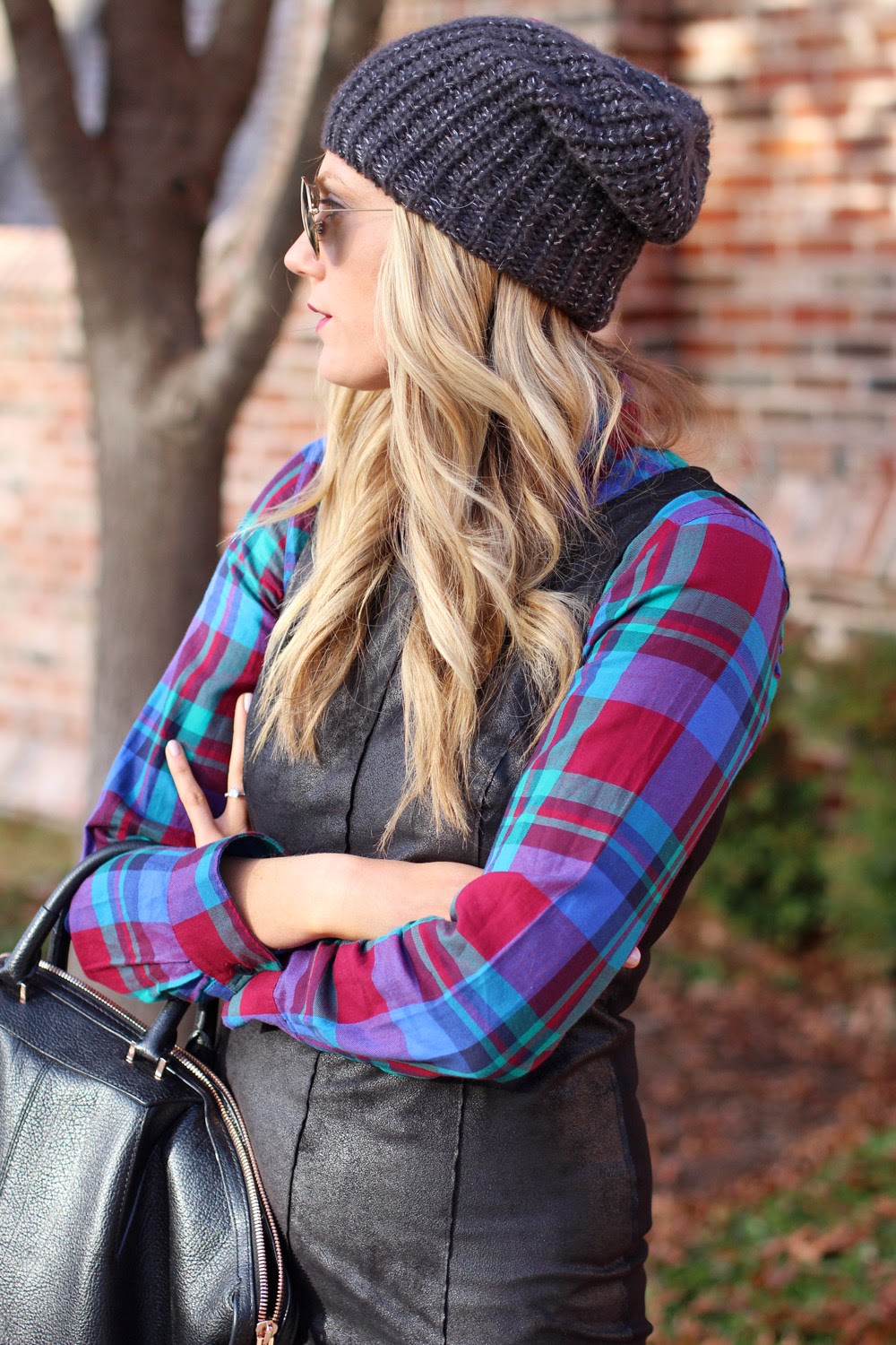 Love the plaid shirt under the leather shift dress and with the beanie- so cute!! I need to remember to start wearing shirts under my dresses!