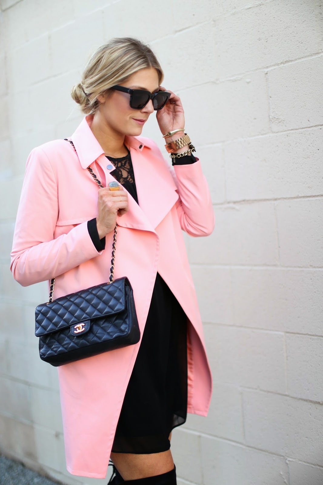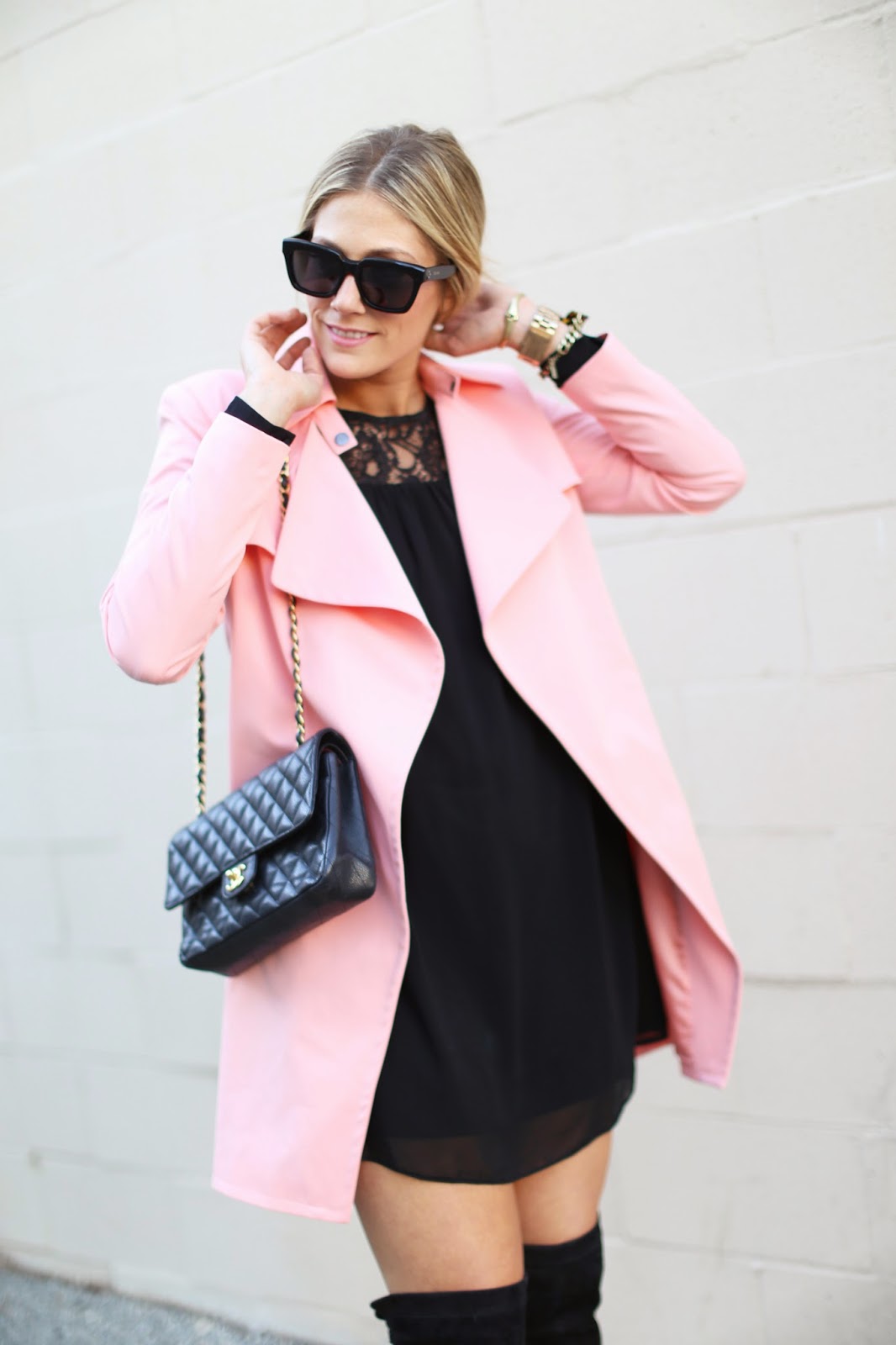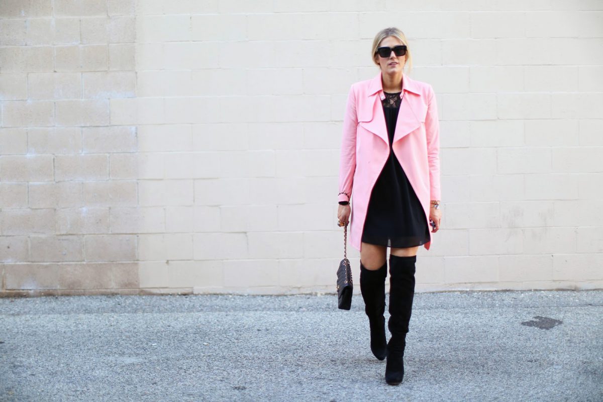 I absolutely love your pink trench coat paired with your over the knee boots!