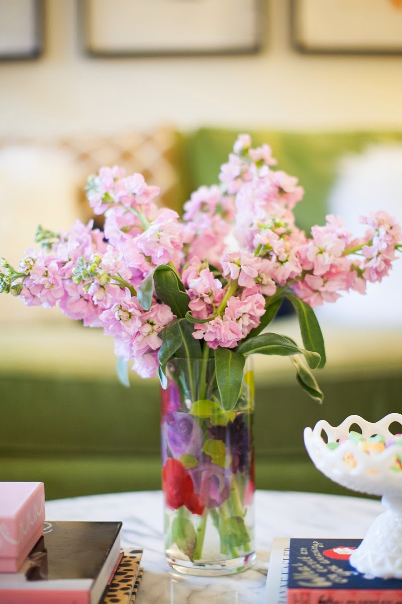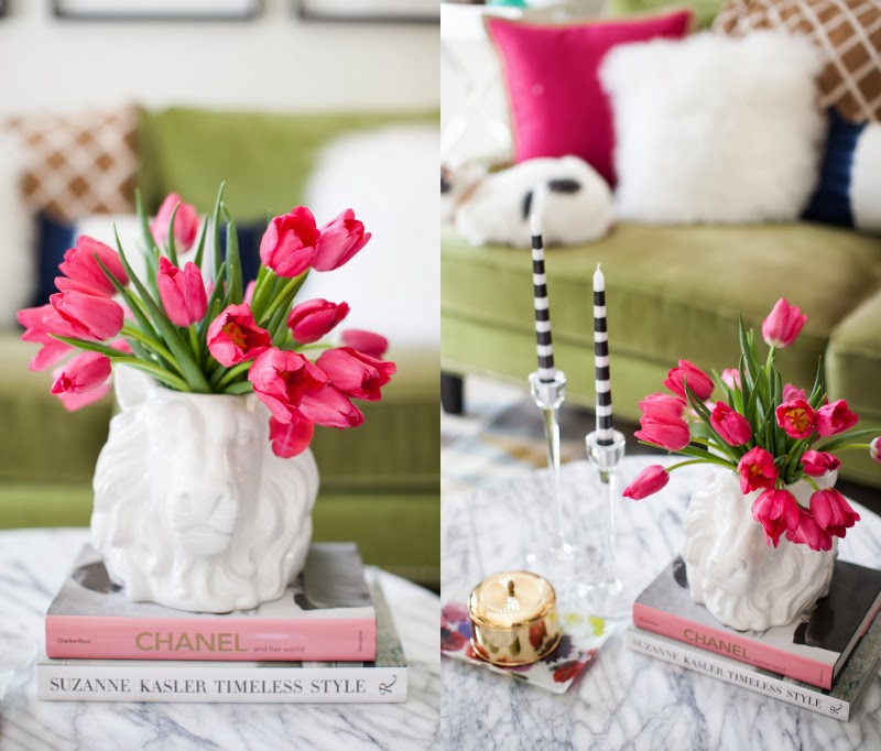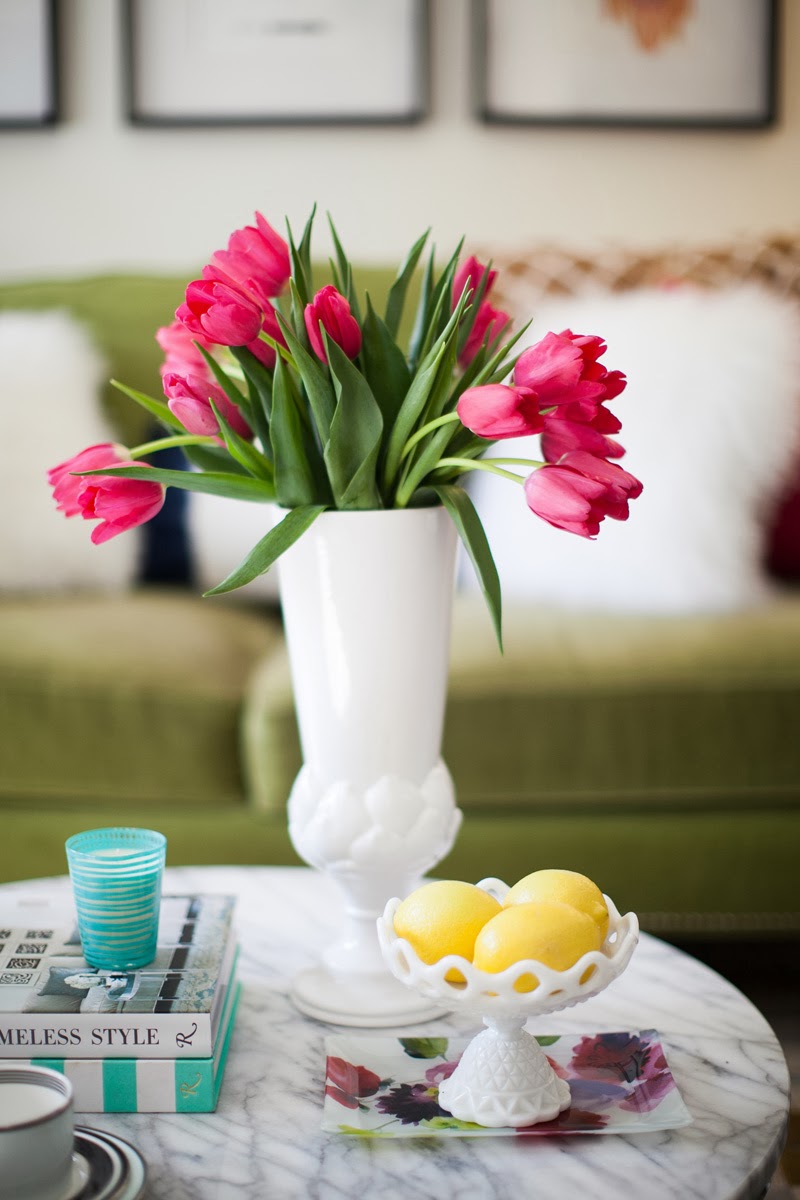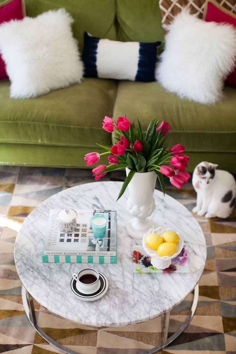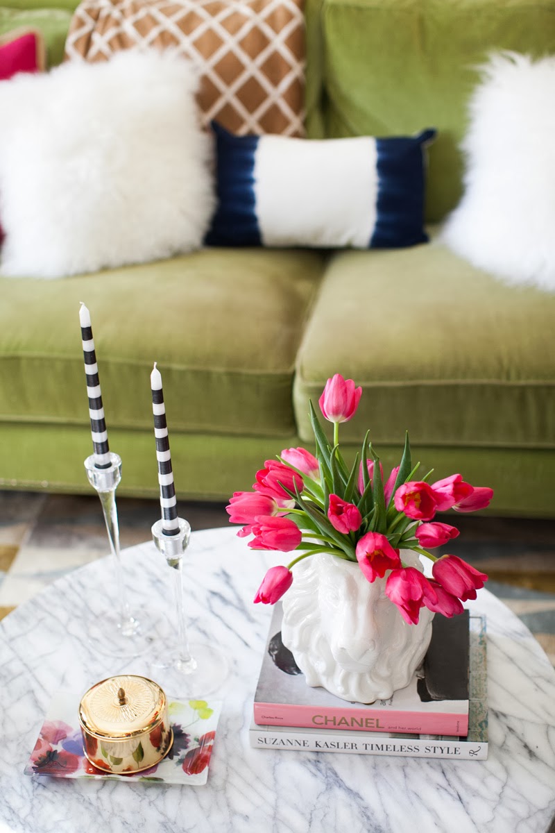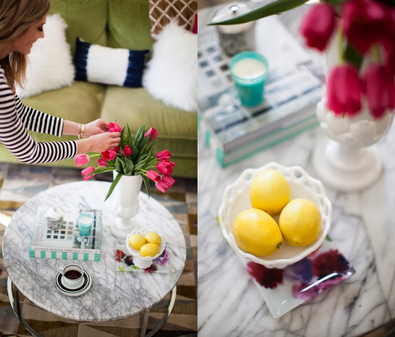 I love adding height to coffee tables. This vase from Lulu & Georgia is the perfect tall object to balance out my coffee table. I added a few books along with a yummy smelling candle to add some color. Another great way to add color on your coffee table is through fresh fruit. On a side note, how adorbs are these tulips? I’m obsessed.