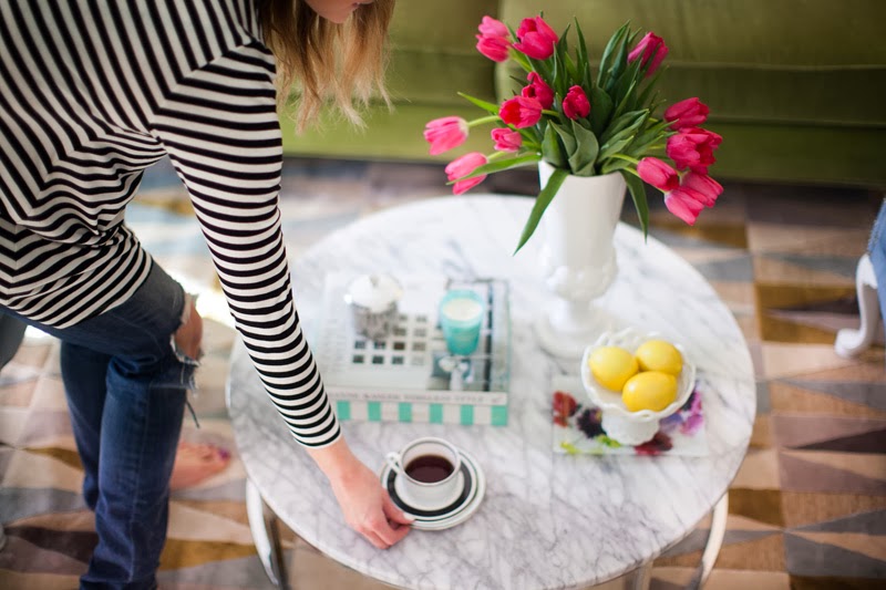 Gorgeous marble coffee table! Also loving the striped candles and fluffy white pillows in the background. This & your tour on Glitter Guide have been among my decor inspiration as I'm decorating my apartment!