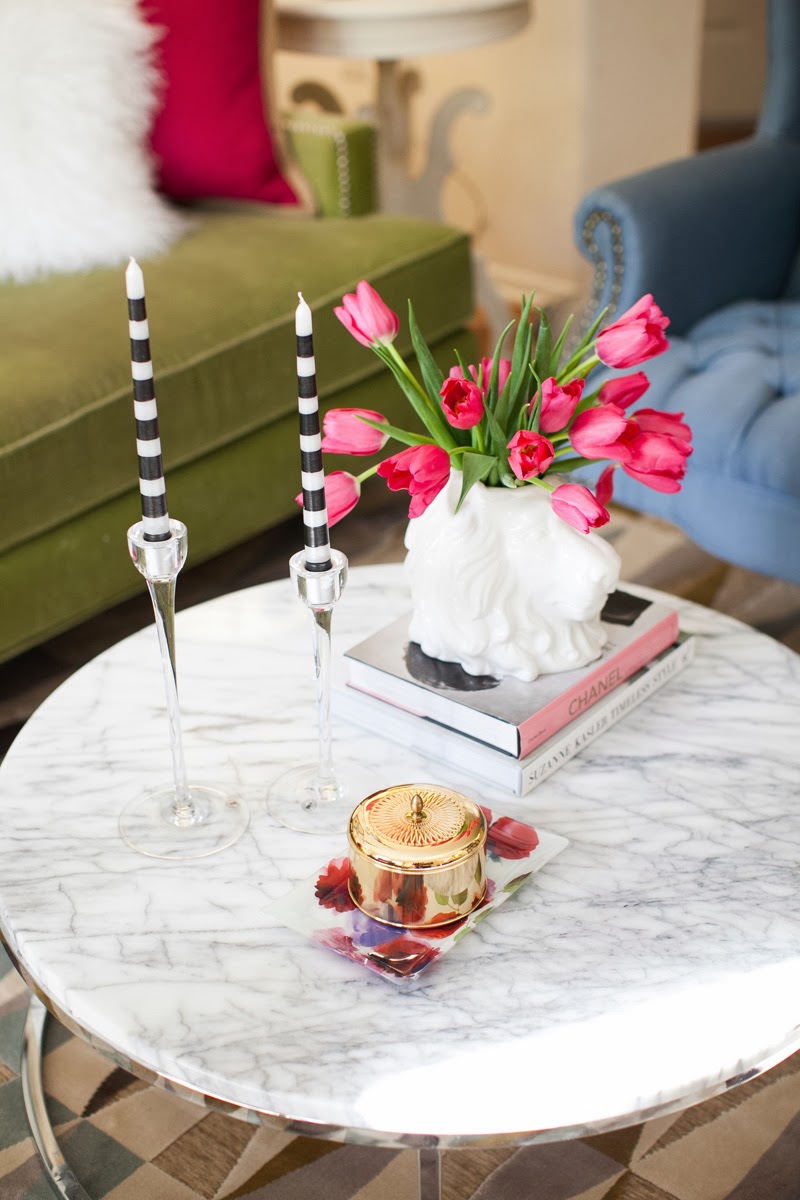 Love the marble coffee table!! Where is it from? Also the striped candles are amazing.