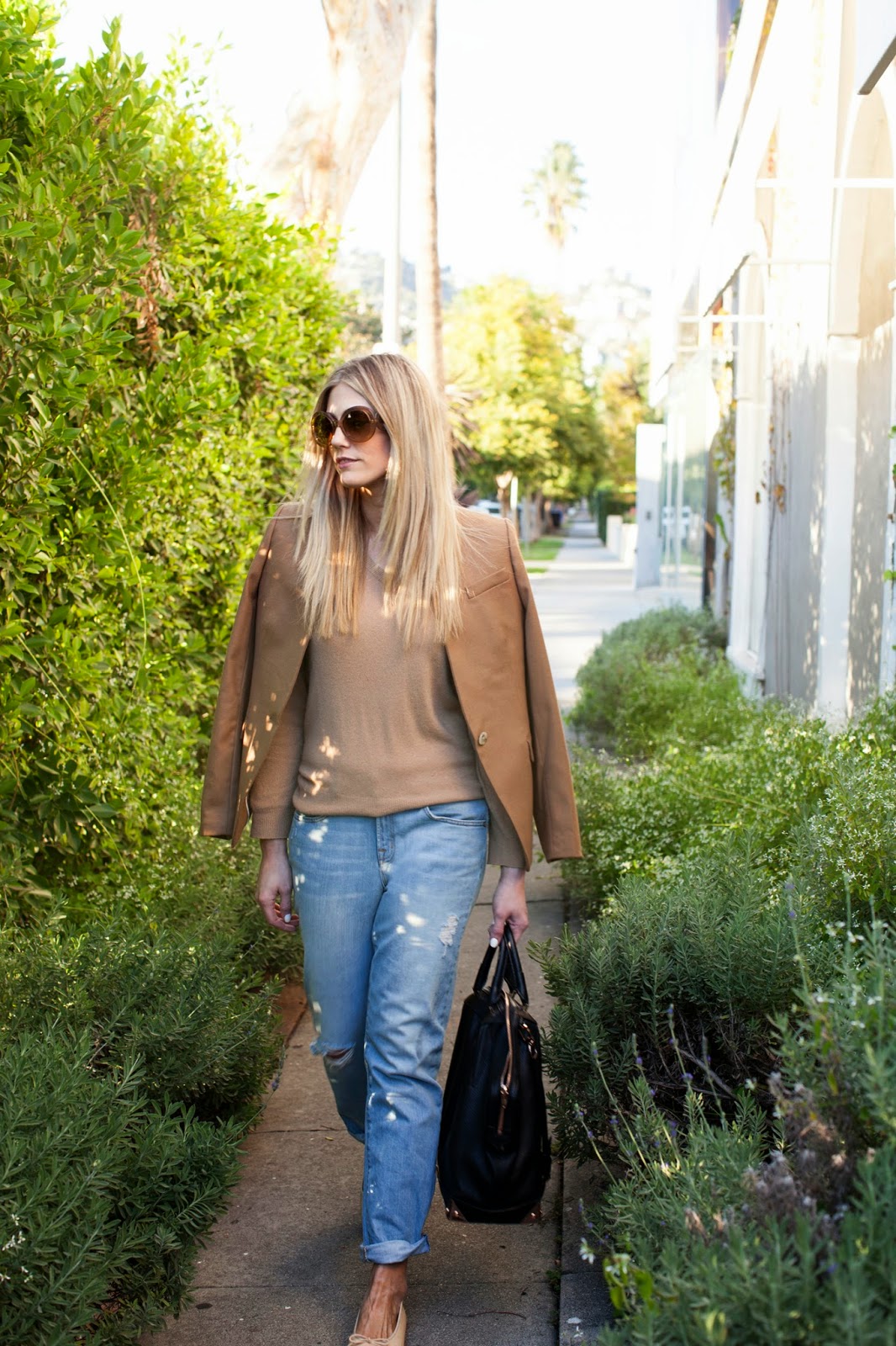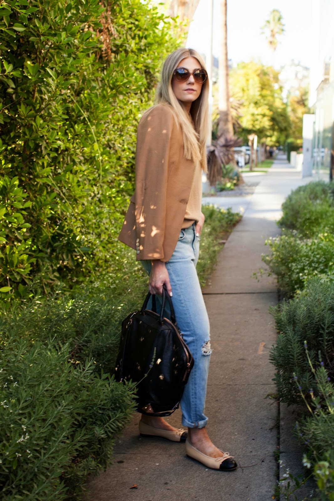 Love this outfit! I love the combination of the camel blazer with boyfriend's jeans. I am kind of jealous that you can wear flats it's winter boots for me! I miss summer so much!