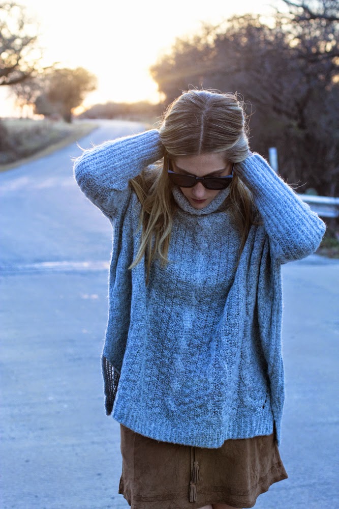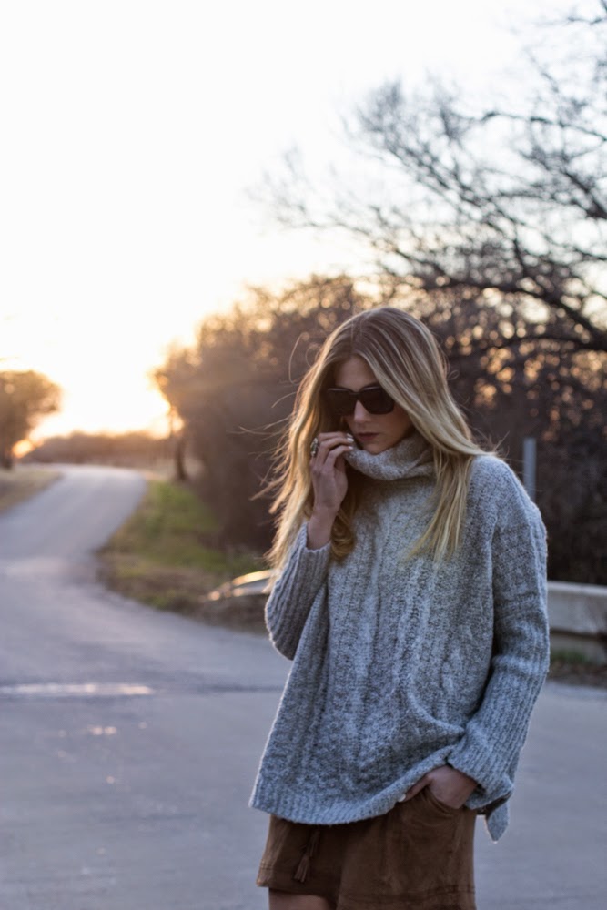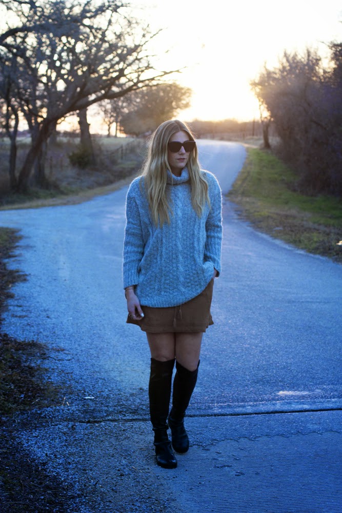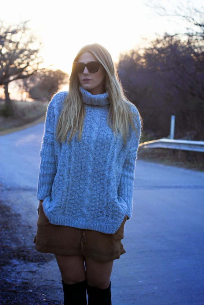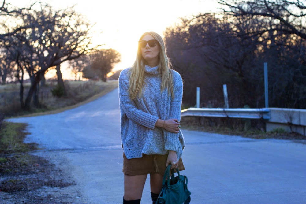 There’s something about a suede Southwestern style skirt that’s ironically extremely wearable and, well, downright comfortable. Paired with a comfy, oversized grey sweater and over the knee Stuart Weitzman boots, the look screams “I didn’t over think my outfit this morning”. And that, my friends, is a great thing.