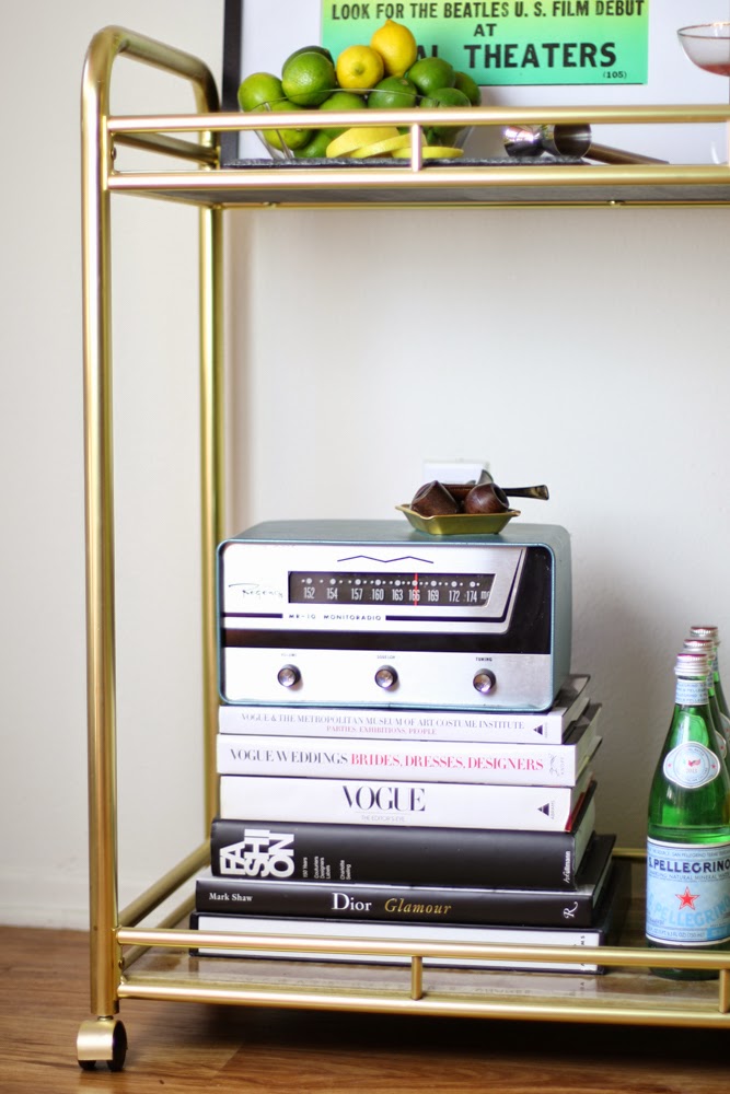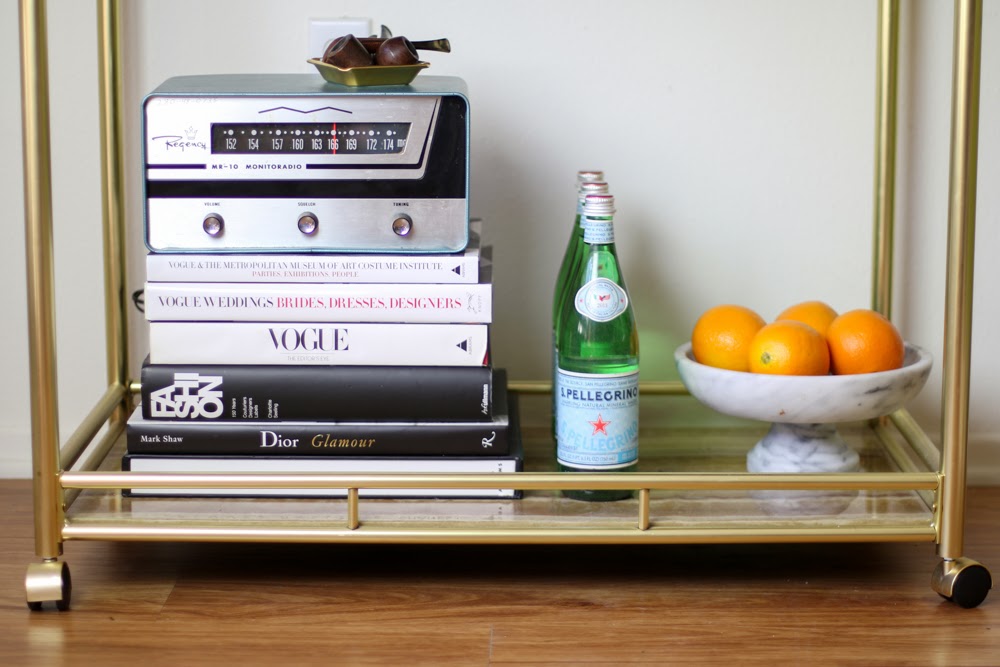 I am constantly thinking of ways to re-decorate our apartment. I get sick of things quickly and as I have gotten older, my style has changed. I may not always let my ideas and visions of decorations come to life, but this time I knew my bar cart needed a serious face lift (previous look). So I’m thinking, where do I even start? So. much. clutter. I had to make it end! So while you’re drinking the refreshing lemon cocktail from my last post, kick back and check out how I re styled this baby and brought her back to life!