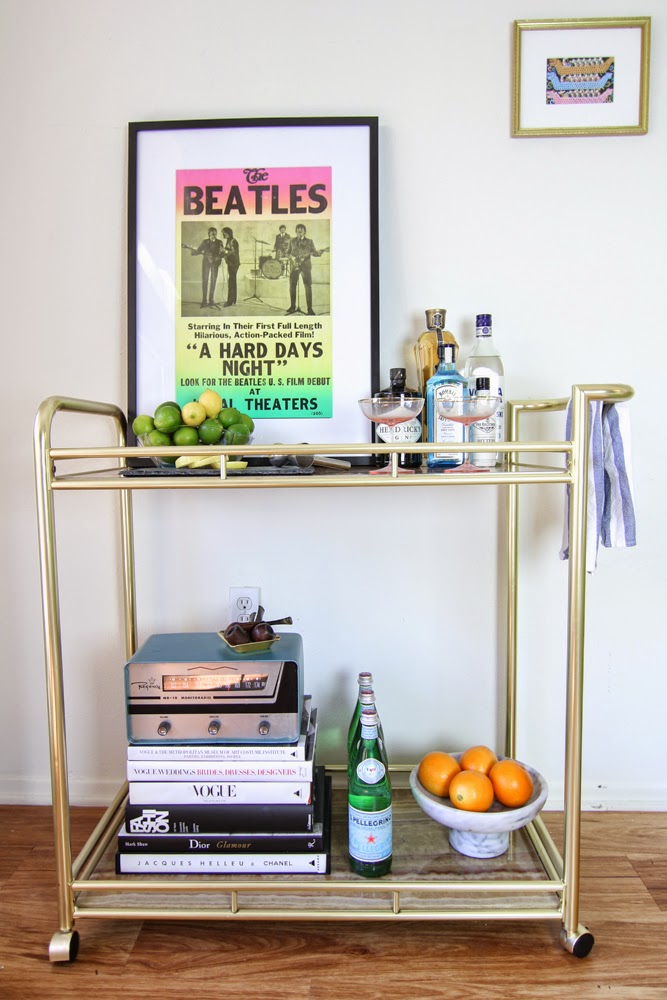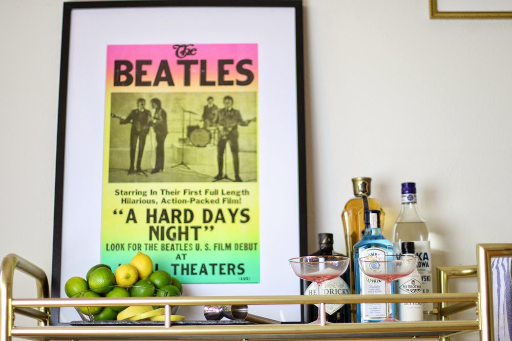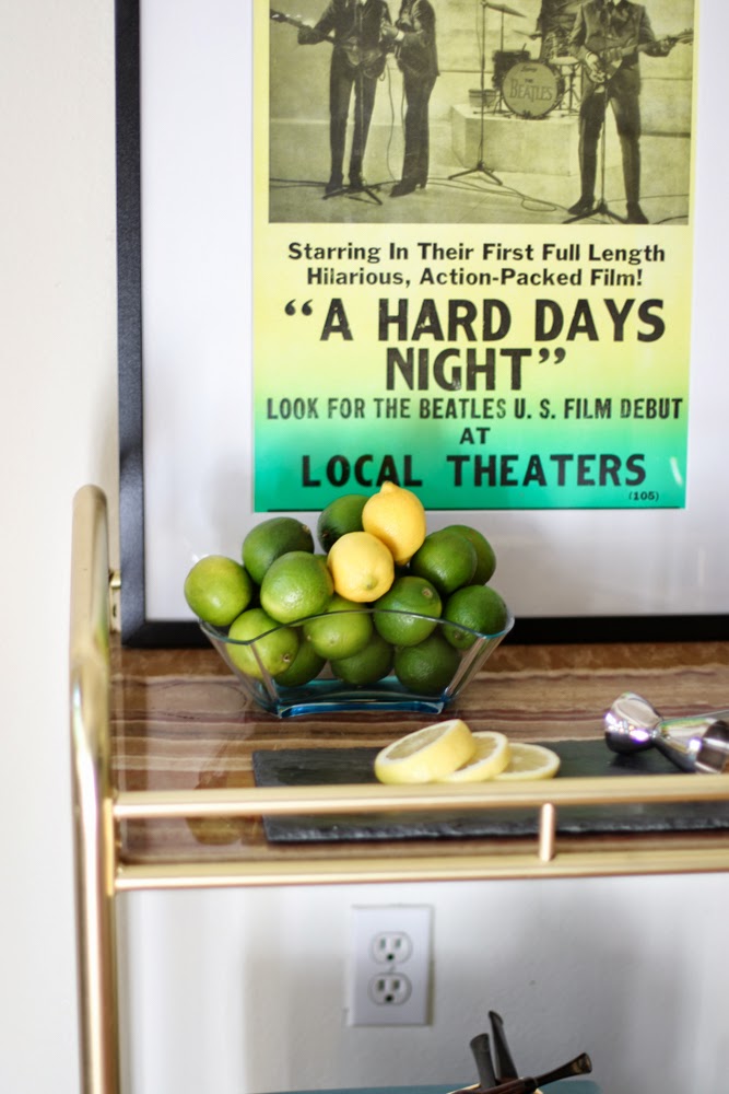 To switch things up, I wanted to take this Beatles poster that is normally in our bedroom and give the bar cart some color. I really like how it turned out! Just the right amount of color for me. And The Beatles are my all time favorite band, ever. So it’s nice to have around the house.