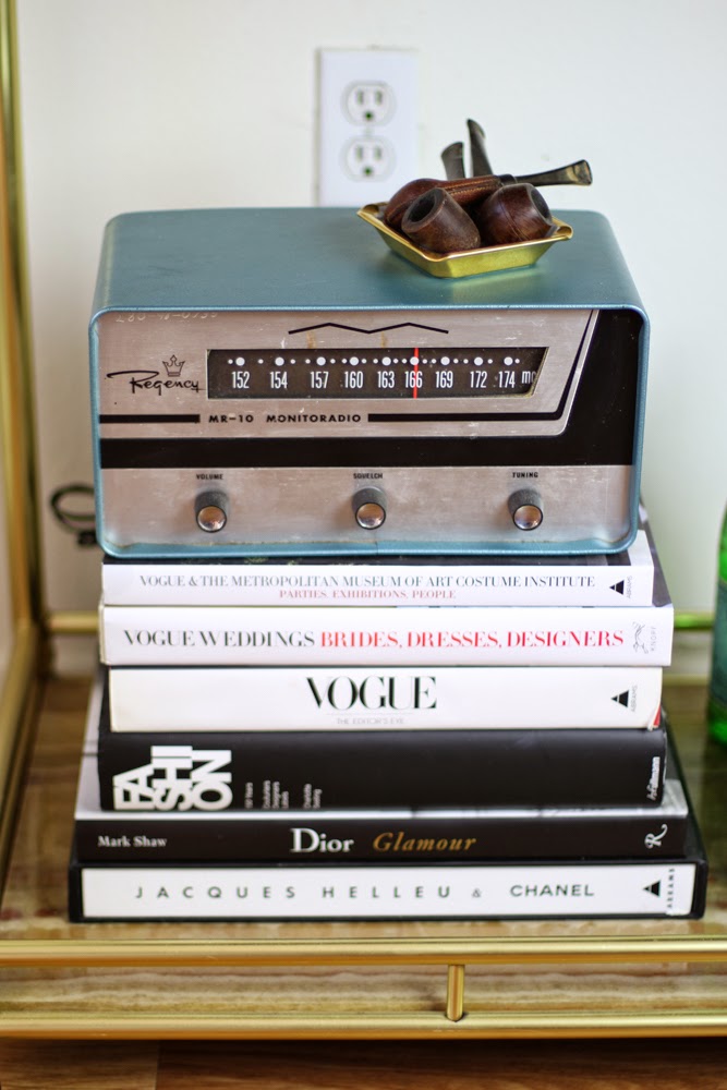I fell in LOVE with this vintage radio while antiquing with my mother in law a few months back. It really works! I think it adds the perfect retro touch on top of several coffee table books. The beautiful marble piece is a wedding gift that I’m obsessed with!