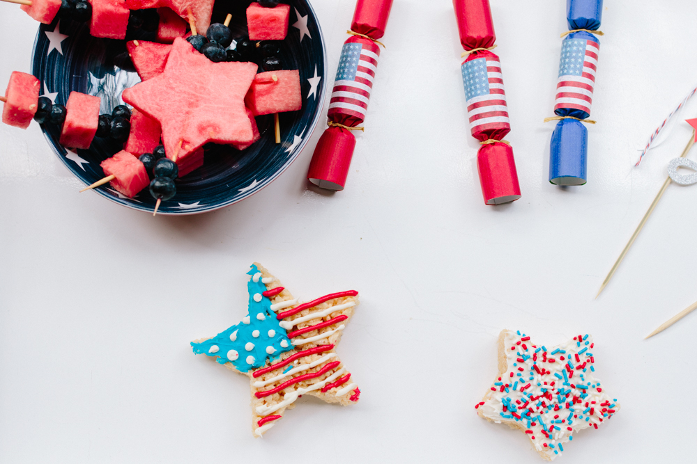 I made these fun little fruit kabobs so quickly! Simply cut out star shapes of watermelon and place on skewer stick after two blueberries ( or however you desire to style it).