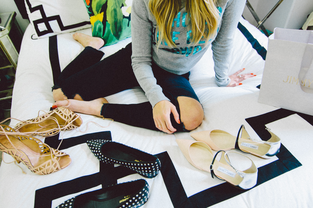 Schutz heels // Saint Laurent flats // Jimmy Choo Flats // my outfit: Zadig & Voltaire sweatshirt // J Brand jeans