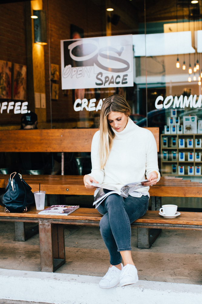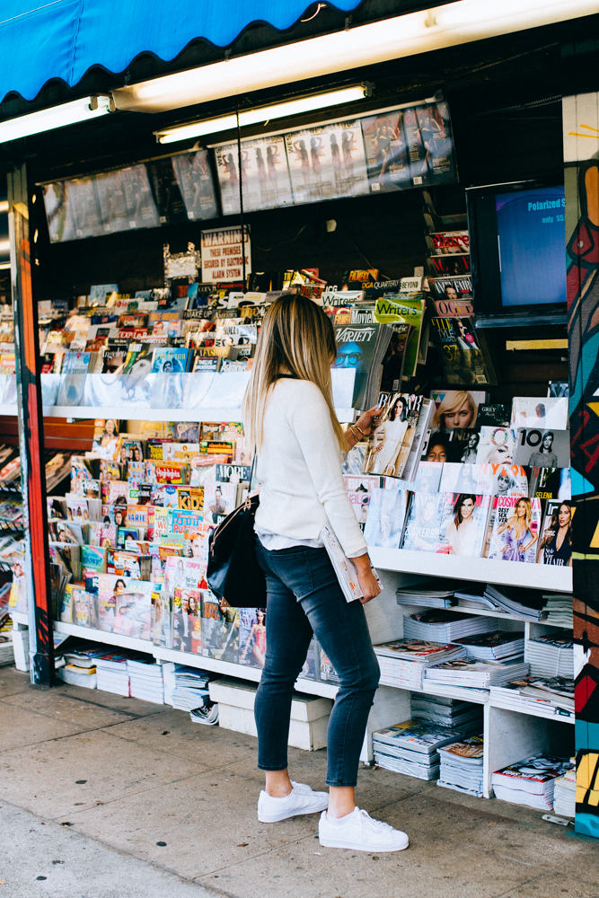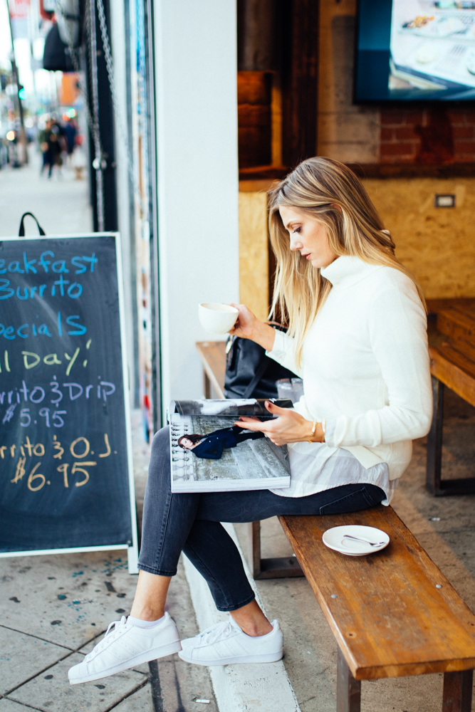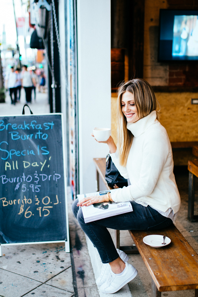 For starters, (almost) every day of the week I get up, I get dressed in something that makes me feel good, and I hit the magazine stand on my way to either a ritual coffee shop or one of the newest spots (there’s something popping up every day it seems like in LA!) The first part of this equation is really important: I get dressed in something that makes me feel good. There’s something about fixing myself up, even if it’s just a little bit, that makes me feel more motivated to tackle my overwhelming (at times) to do list. Since it’s starting to slowly transition into fall weather around here, my go-to feel good pieces are cashmere sweaters, plaid button downs and denim from Uniqlo.