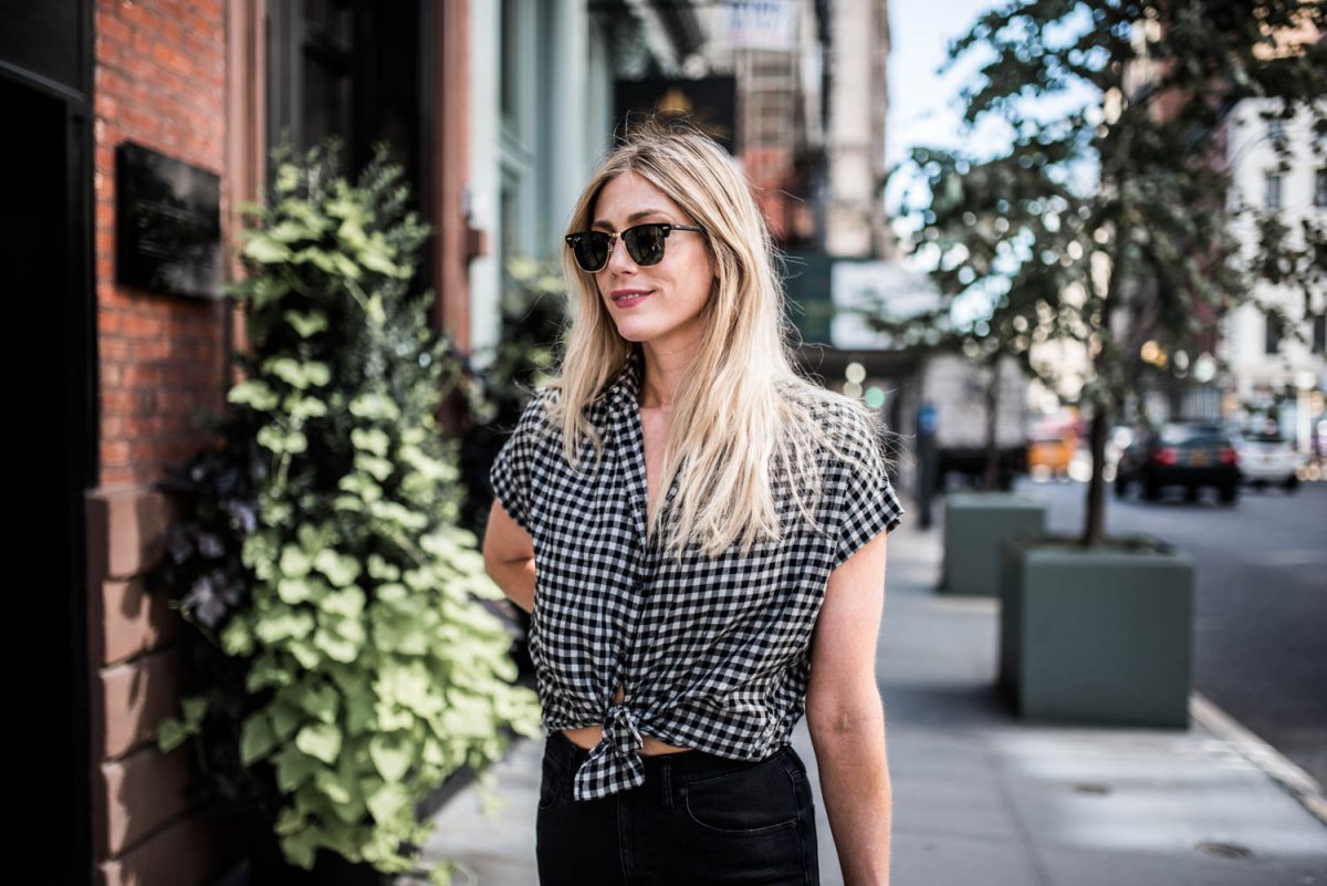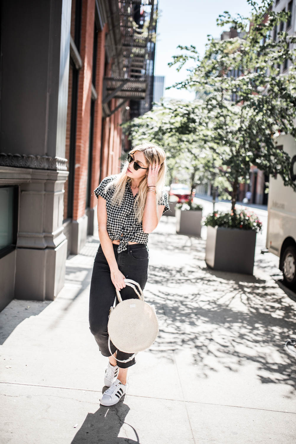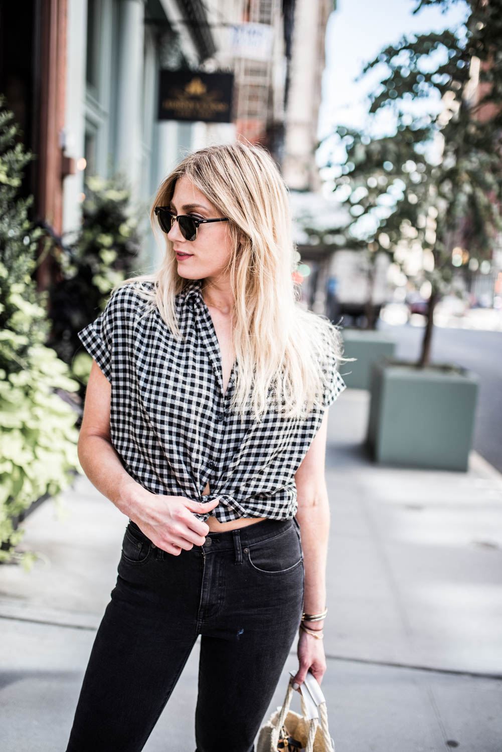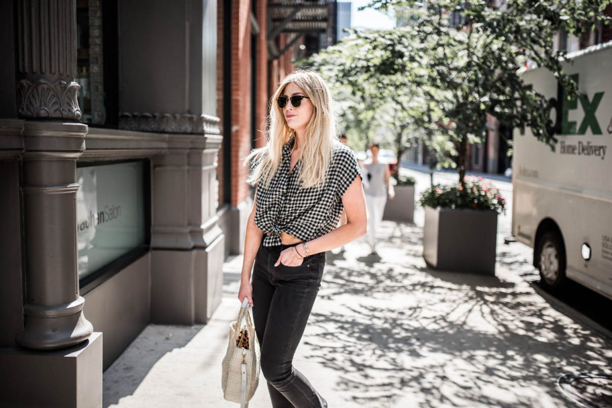 We had a couple of hours of free time, so I threw on this fun look to stay cool while shopping around in Soho. I love the gingham shirt tied up with these higher waisted pants. It’s flattering and cool for crazy hot temps like we had.