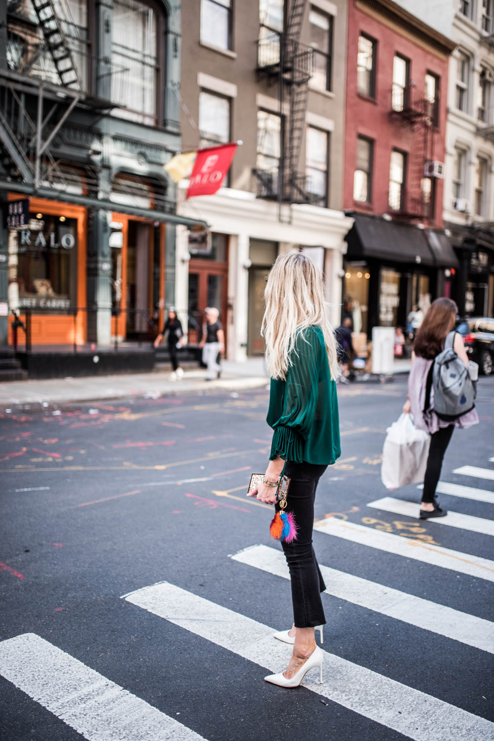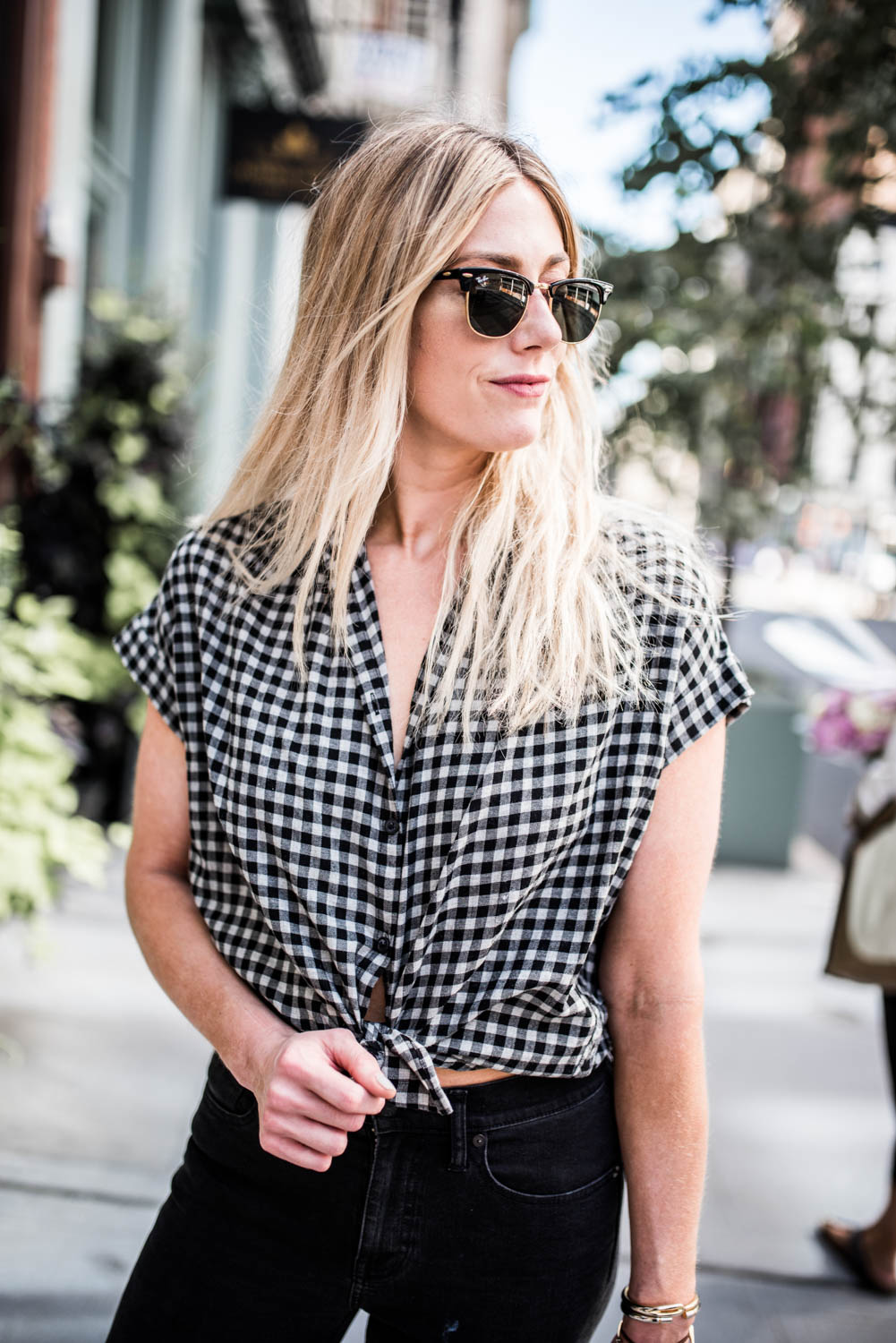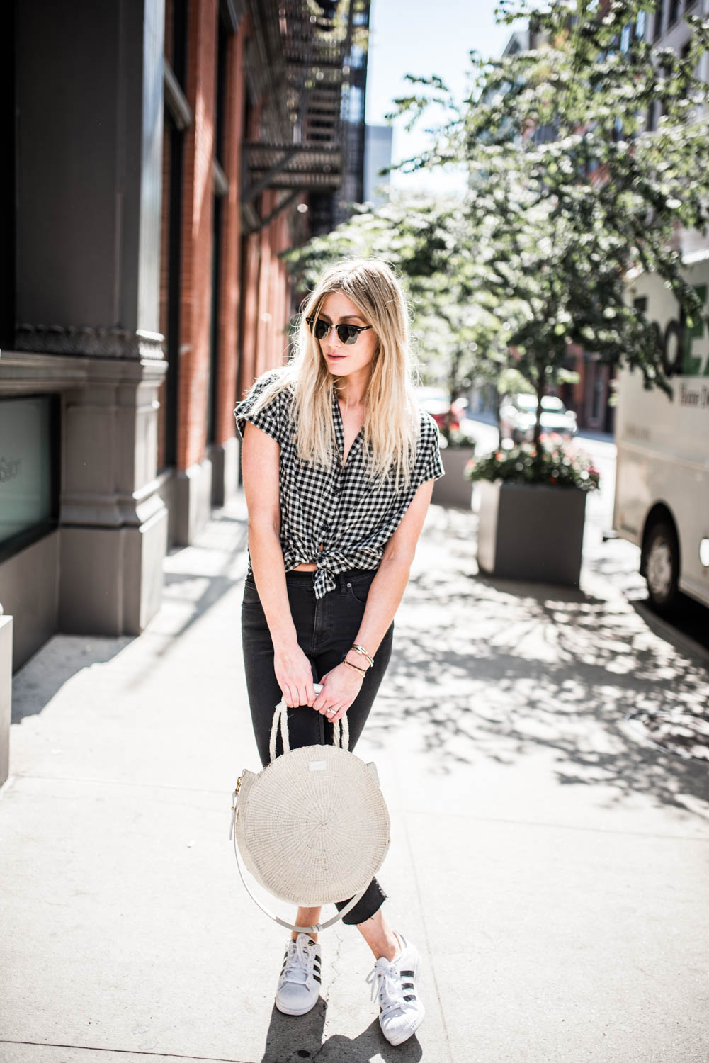 We had a couple of hours of free time, so I threw on this fun look to stay cool while shopping around in Soho. I love the gingham shirt tied up with these higher waisted pants. It’s flattering and cool for crazy hot temps like we had.